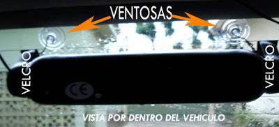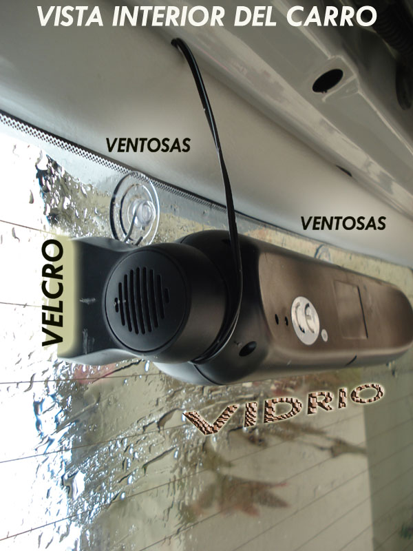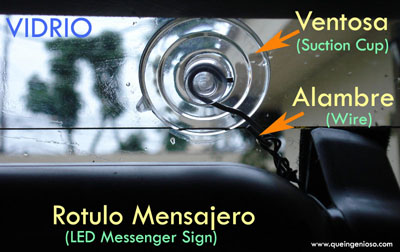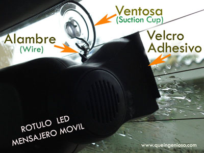 sobre el VIDRIO (Para camionetas, SUVS etc) - Considere esta opcion si no desea Atornillarlo, y temporalmente desea andarlo exhibido directamente sobre el vidrio (por la parte interior del carro) La forma de fijar el aparato a su carro puede variar segun el modelo, pero a continuacion se describe una forma practica de hacerlo para una instalacion de caracter temporal usando materiales que puede encontrar en una ferreteria. Las cintas DOBLE PEGA incluidas con el producto no son suficientemente fuertes para sujetar el rotulo contra el vidrio pues con el calor del sol terminaran debilitando su poder de adherencia, y el movimiento del carro puede afectar su estabilidad. PASOS para la instalacion con el metodo COMBO VELCRO y VENTOSAS (Suction Cups):
