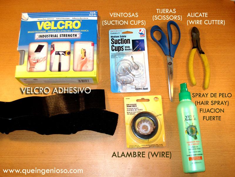 (fuerte) 2. VENTOSAS de hule con Gancho incorporado (Suction cups) 3. TIJERAS 4. ALICATE para cortar alambre 5. ALAMBRE delgado para usarlo de Cable sujetador (preferiblemente galvanizado o similar- no oxidable) 6. Bote de SPRAY para sujetar cabello (HAIR SPRAY)
