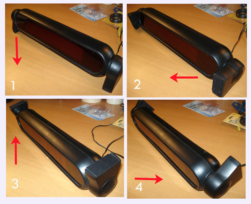 1) Patas hacia abajo (Descansando sobre un apoyo o superficie Horizontal) 2) Patas hacia el frente (Pegar a un Vidrio) 3) Patas hacia arriba (Atornillar a el techo por dentro) 4) Patas hacia atras (Fijar a una pared u otra superficie vertical) |